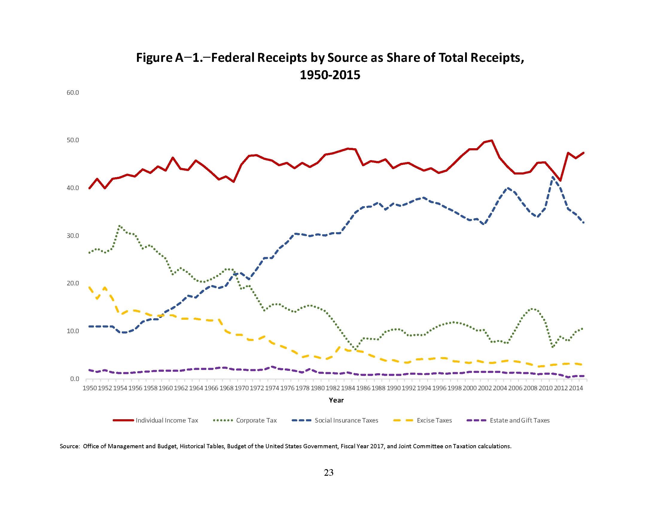 As discussed in the TaxProfBlog the Joint Committee on Taxation has released its overview of the federal tax system.  Noteworthy in the JCT’s finding is in table A-1 on pg. 23, the corporate income tax revenues received by the IRS has steadily declined since 1950, while individual income taxes and social security taxes continue to rise.  See the chart below: